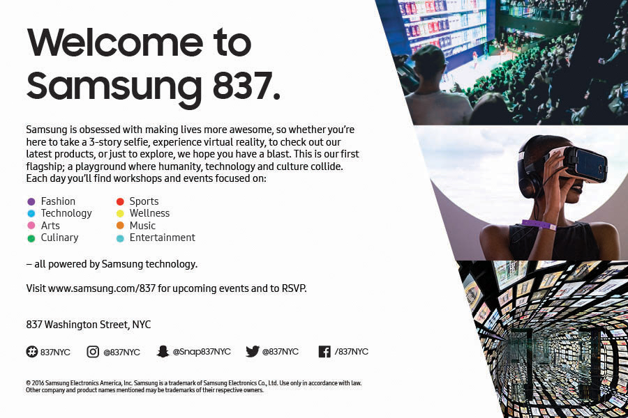 Samsung 837, is a unique, non-retail event space in the heart of Manhattan's Meatpacking District and the jewel of Samsung Electronics. Part of my responsibilities were to develop OOH collateral for the events that would occur there on a monthly basis. One such event was the 2016 Summer Olympics in Rio, aptly titled Rio Remotely. Rio Remotely was a fun and interactive way for consumers and patrons of the location to take part in product demos, taste Rio inspired food and watch the Olympic games everyday on a 3-story tv screen. The designs below reflected pieces produced such as: promotional postcards, digital menus and event signage.