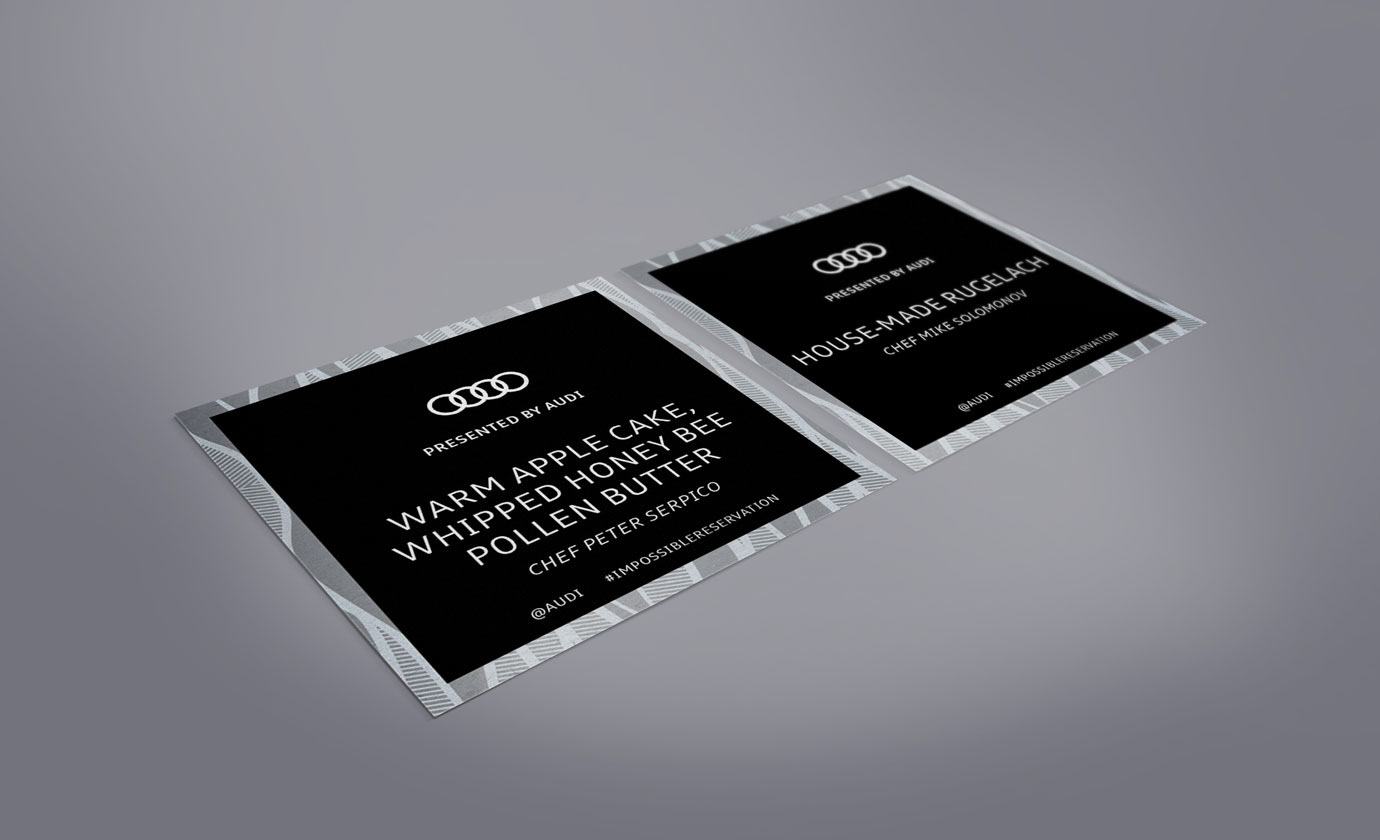 I was asked to redesign Audi's Impossible Reservation collateral which consisted of individual table menus, cocktail menu cards placed in acrylic frames throughout restaurant's bar areas, as well as stickers for the snacks/desserts.